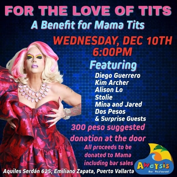 La comunidad de Puerto Vallarta está organizando un evento benéfico para apoyar al artista drag Mama Tits (Brian Peters), que se enfrenta a graves problemas médicos que requieren tratamiento continuo. El evento, titulado «Por amor a las tetas», se celebrará en el bar restaurante Awaysis, situado en Aquiles Serdán 625, Zona Romántica, el miércoles 10 de diciembre a las 18 horas.
